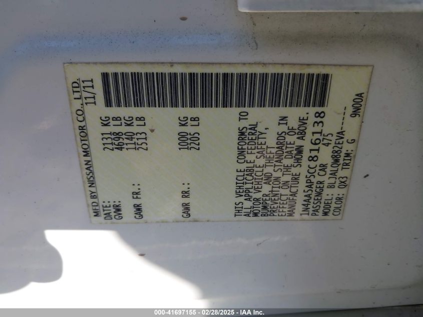 Color WhiteCylinders 6Drive Front wheel driveVIN 1N4AA5AP5CC******State Run & Drive VerifiedDamage Front or back