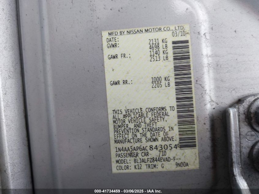 Color SilverCylinders 6Drive Front wheel driveVIN 1N4AA5AP6AC******State Run & Drive VerifiedDamage Rear leftAuction date 2025-03-26