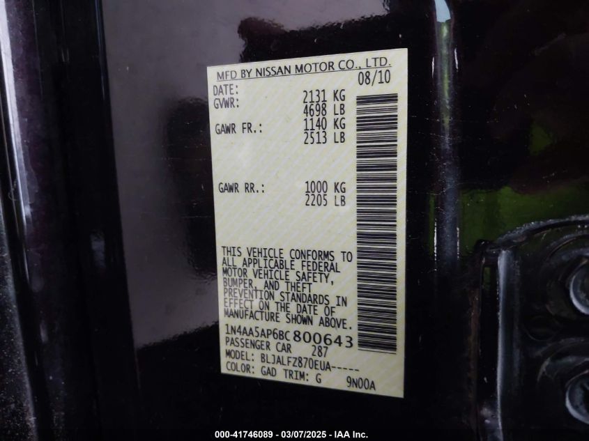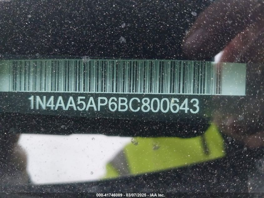 Color VioletCylinders 6Drive Front wheel driveVIN 1N4AA5AP6BC******State Run & Drive VerifiedDamage Front or back