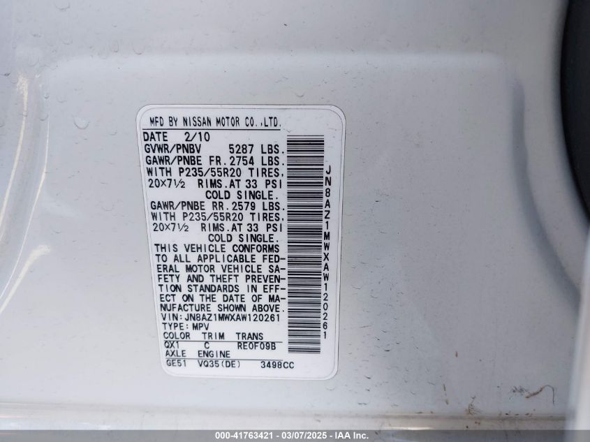 Color WhiteCylinders 6Drive Full driveVIN JN8AZ1MWXAW******State Run & Drive VerifiedDamage InsignificantAuction date 2025-03-24 AutoRIA
