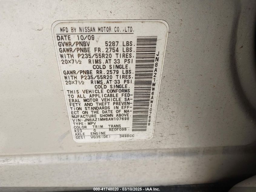 2010 NISSAN MURANO 2010 Gasoline, 3.5, Full drive, VIN - JN8AZ1MW6AW****** from the USA