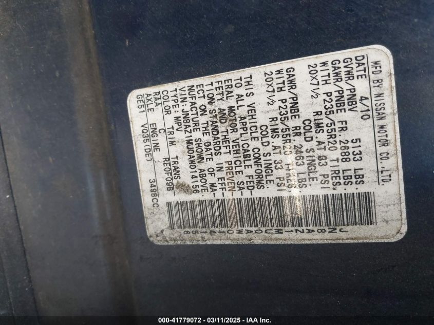 2010 NISSAN MURANO 2010 Gasoline, 3.5, Front wheel drive, VIN - JN8AZ1MU0AW****** from the USA