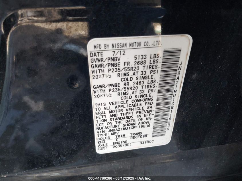 Color BlackCylinders 6Drive Front wheel driveVIN JN8AZ1MU1CW******State Run & Drive VerifiedDamage Front or back AutoRIA