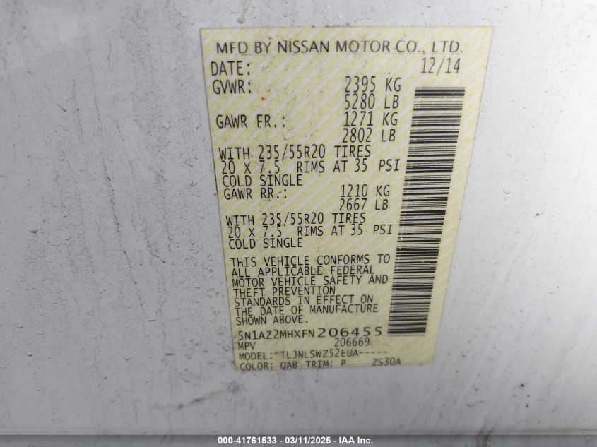 Color WhiteCylinders 6Drive Full driveVIN 5N1AZ2MHXFN******State Run & Drive VerifiedDamage Front left AutoRIA