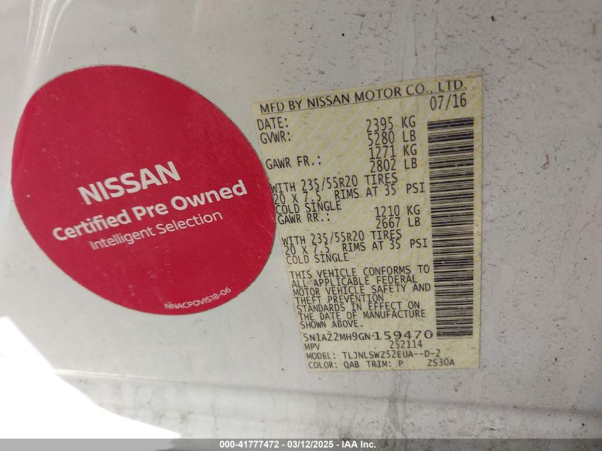 Color WhiteCylinders 6Drive Full driveVIN 5N1AZ2MH9GN******State Run & Drive VerifiedDamage Right side AutoRIA