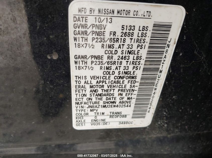 2014 NISSAN MURANO 2014 Gasoline, 3.5, Front wheel drive, VIN - JN8AZ1MU2EW****** from the USA