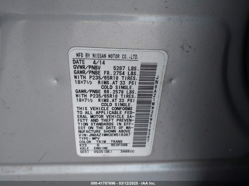 Color SilverCylinders 6Drive Full driveVIN JN8AZ1MW3EW******State Run & Drive VerifiedDamage Right sideAuction date 2025-03-21 AutoRIA