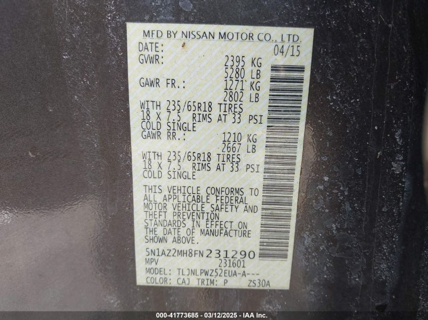 Color BrownCylinders 6Drive Full driveVIN 5N1AZ2MH8FN******State Run & Drive VerifiedDamage Back AutoRIA