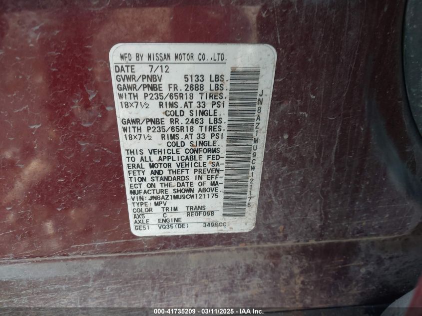 Color BurgundyCylinders 6Drive Front wheel driveVIN JN8AZ1MU9CW******State Run & Drive VerifiedDamage Insignificant AutoRIA