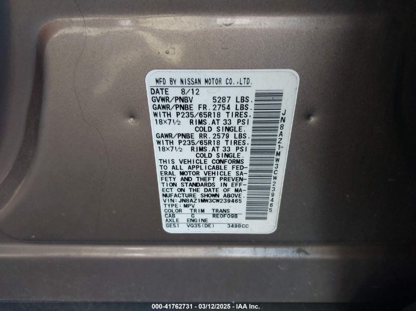 Color BrownCylinders 6Drive Full driveVIN JN8AZ1MW3CW******State Run & Drive VerifiedDamage Rear right AutoRIA