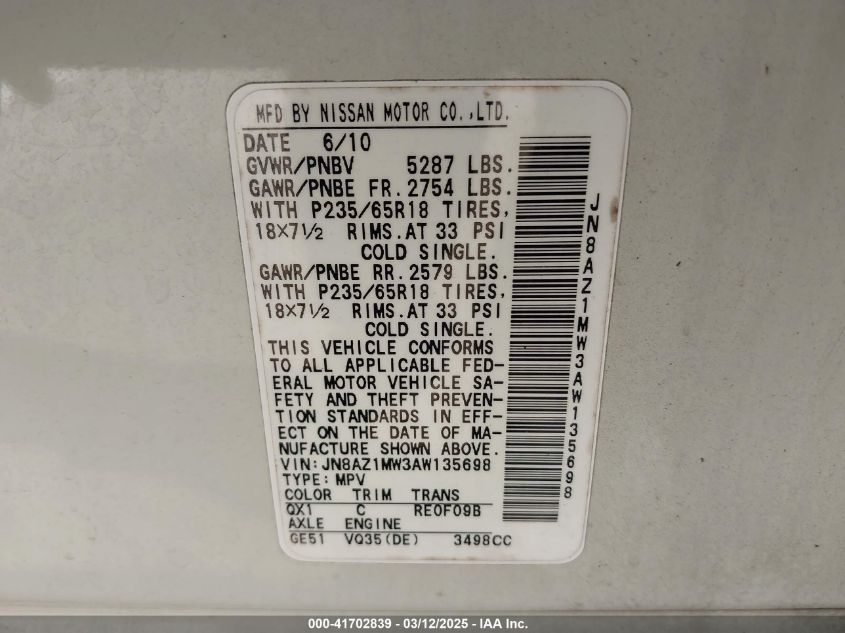 2010 NISSAN MURANO 2010 Gasoline, 3.5, Full drive, VIN - JN8AZ1MW3AW****** from the USA