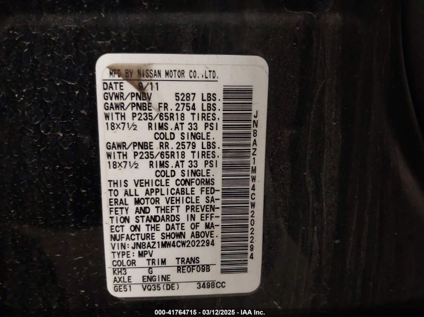 Color BlackCylinders 6Drive Full driveVIN JN8AZ1MW4CW******State Run & Drive VerifiedDamage Front or back AutoRIA