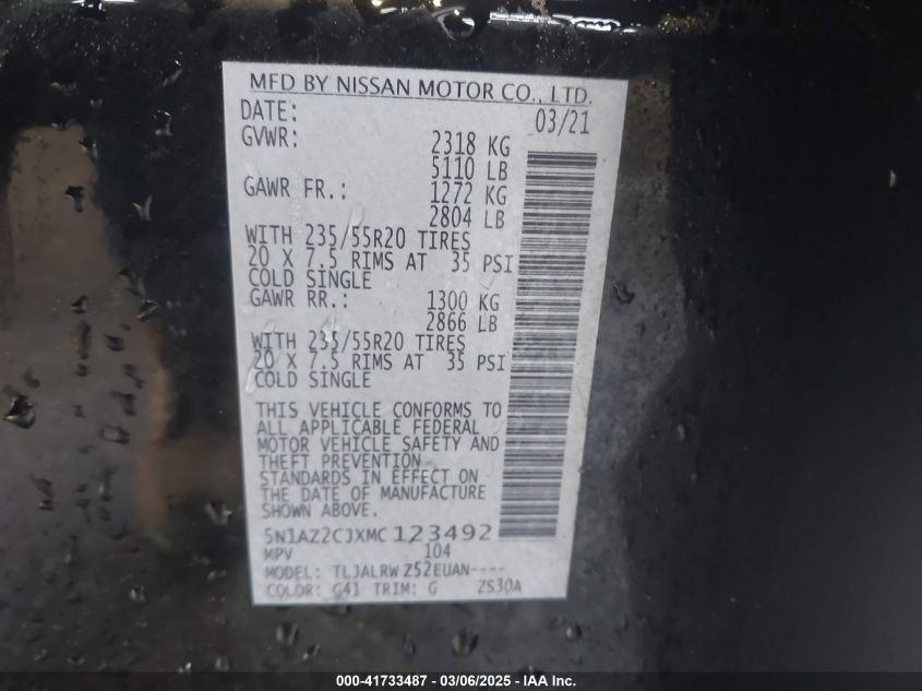 2021 NISSAN MURANO 2021 Gasoline, 3.5, Front wheel drive, VIN - 5N1AZ2CJXMC****** from the USA