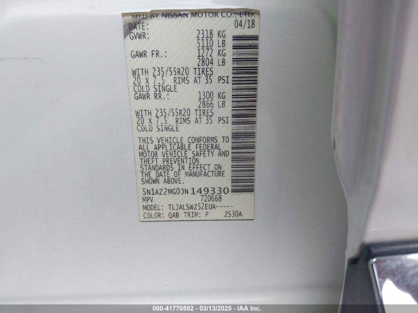 2018 NISSAN MURANO 2018 Gasoline, 3.5, Front wheel drive, VIN - 5N1AZ2MG0JN****** from the USA