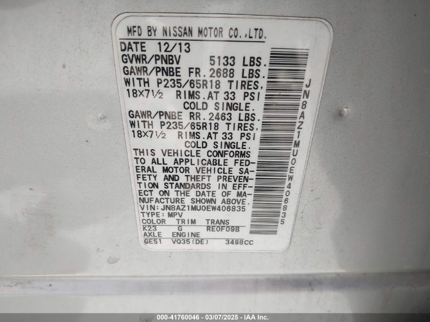 Color SilverCylinders 6Drive Front wheel driveVIN JN8AZ1MU0EW******State Run & Drive VerifiedDamage Front and backAuction date 2025-03-21 AutoRIA
