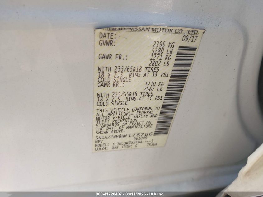 Color WhiteCylinders 6Drive Full driveVIN 5N1AZ2MH8HN******State Run & Drive VerifiedDamage Front or back AutoRIA