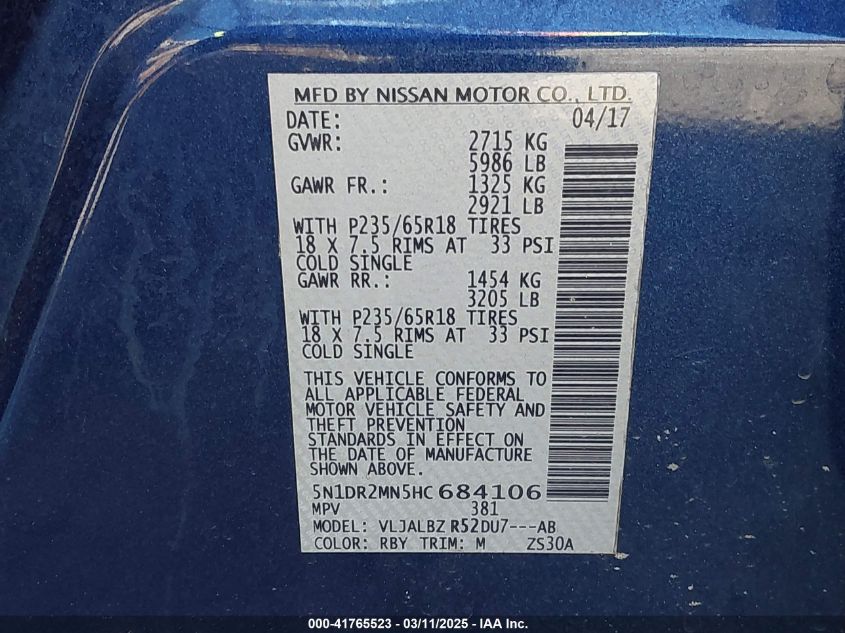 2017 NISSAN PATHFINDER 2017 Gasoline, 3.5, Front wheel drive, VIN - 5N1DR2MN5HC****** from the USA