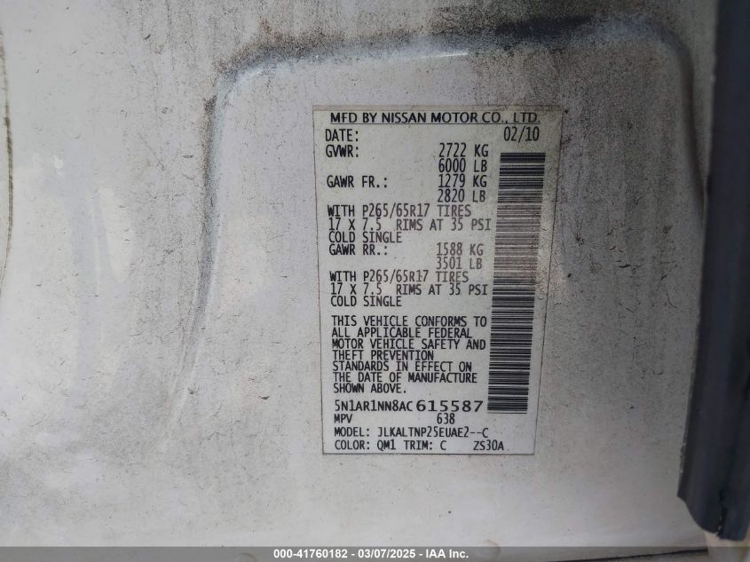 2010 NISSAN PATHFINDER 2010 Gasoline, 4.0, Unknown, VIN - 5N1AR1NN8AC****** from the USA