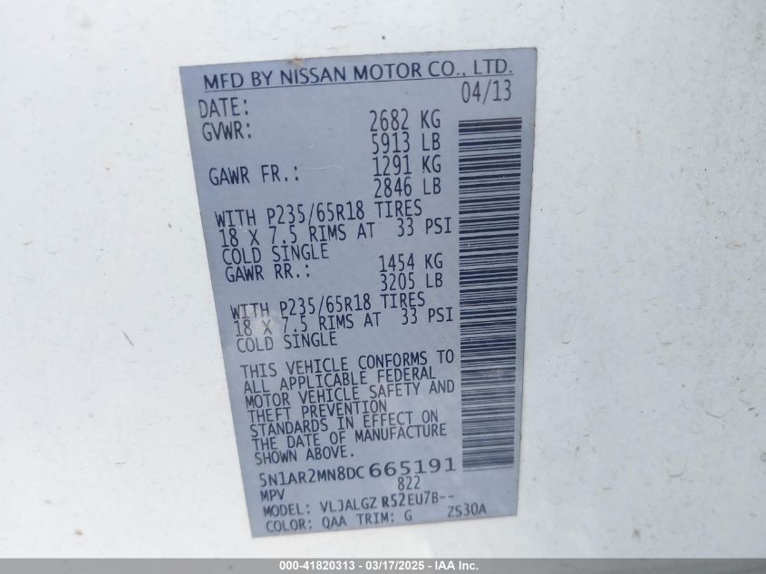 Color WhiteCylinders 6Drive Front wheel driveVIN 5N1AR2MN8DC******State Run & Drive VerifiedDamage Insignificant AutoRIA