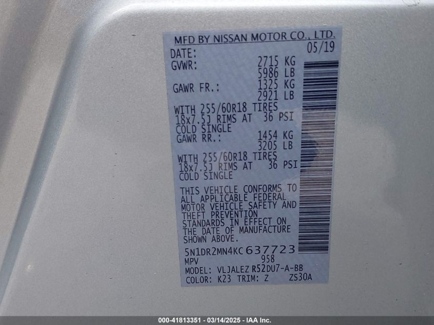Color GrayCylinders 6Drive Front wheel driveVIN 5N1DR2MN4KC******State Run & Drive VerifiedDamage Front or back AutoRIA