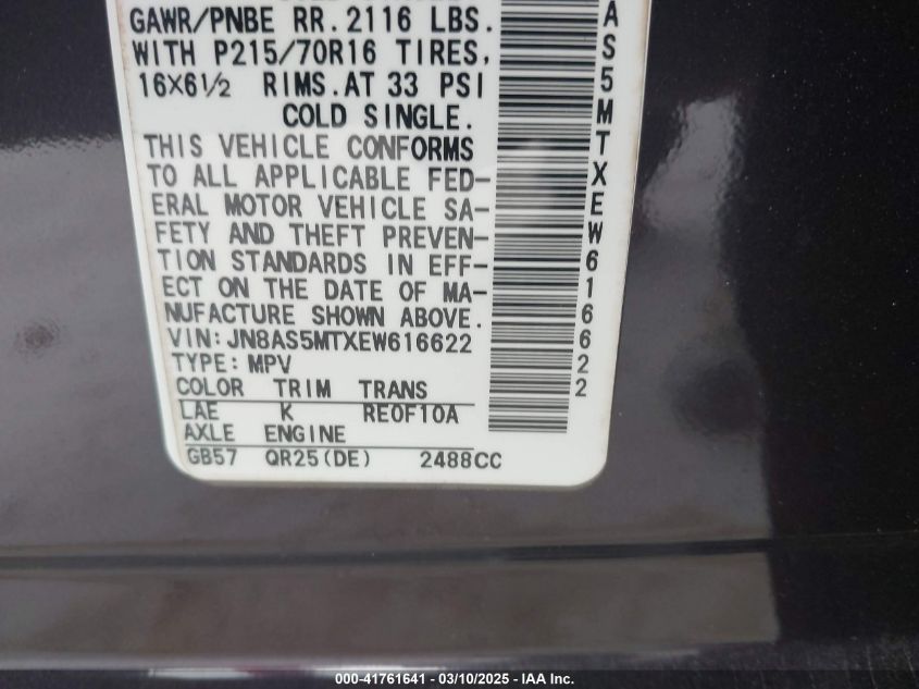 Color BlackCylinders 4Drive Front wheel driveVIN JN8AS5MTXEW******State Run & Drive VerifiedDamage Right side AutoRIA