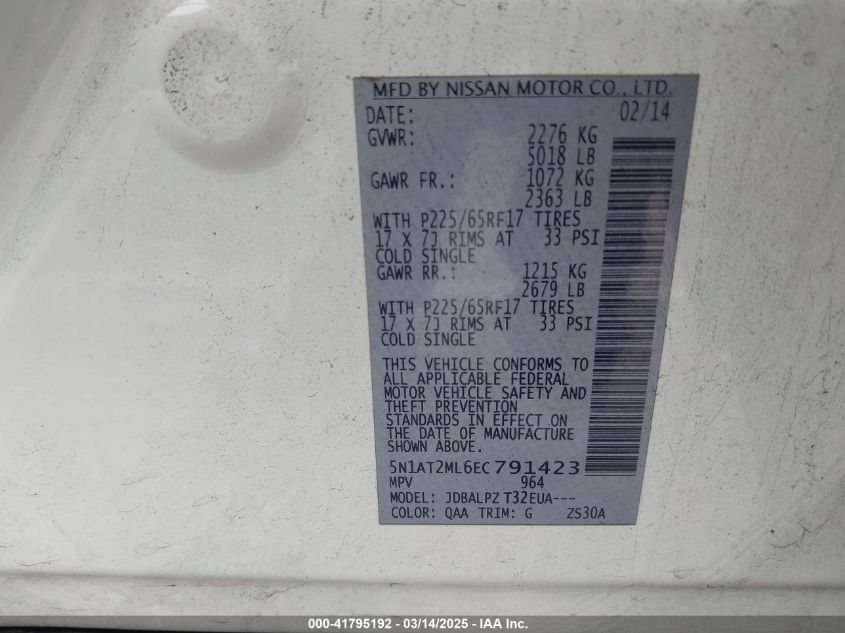 Color WhiteCylinders 4Drive Front wheel driveVIN 5N1AT2ML6EC******State Run & Drive VerifiedDamage Back AutoRIA