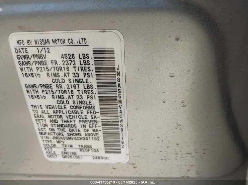 Color SilverCylinders 4Drive Full driveVIN JN8AS5MV4CW******State Run & Drive VerifiedDamage Front or back AutoRIA