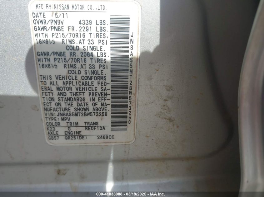 Color SilverCylinders 4Drive Front wheel driveVIN JN8AS5MT2BW******State Run & Drive VerifiedDamage Front or back AutoRIA