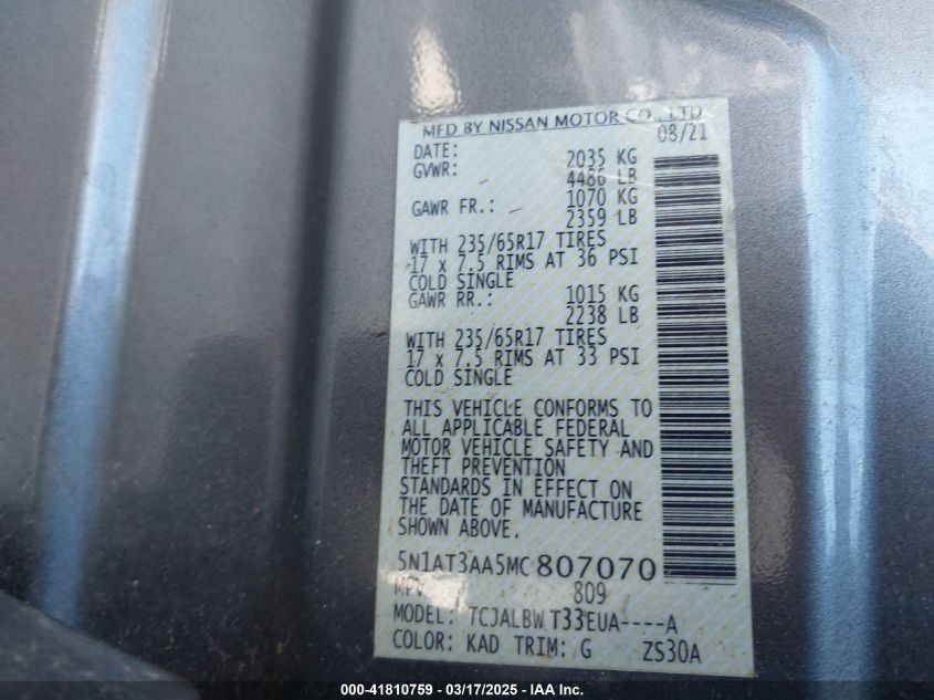2021 NISSAN ROGUE 2021 Gasoline, 2.5, Front wheel drive, VIN - 5N1AT3AA5MC****** from the USA