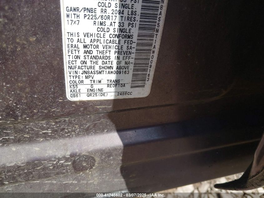 2010 NISSAN ROGUE 2010 Gasoline, 2.5, Front wheel drive, VIN - JN8AS5MT1AW****** from the USA