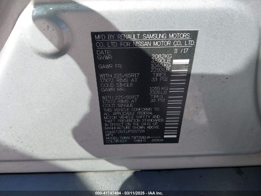 2018 NISSAN ROGUE 2018 Gasoline, 2.5, Front wheel drive, VIN - KNMAT2MT1JP****** from the USA