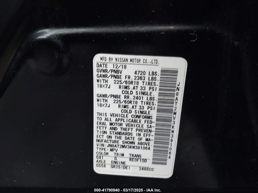 2019 NISSAN ROGUE 2019 Gasoline, 2.5, Full drive, VIN - JN8AT2MV3KW****** from the USA