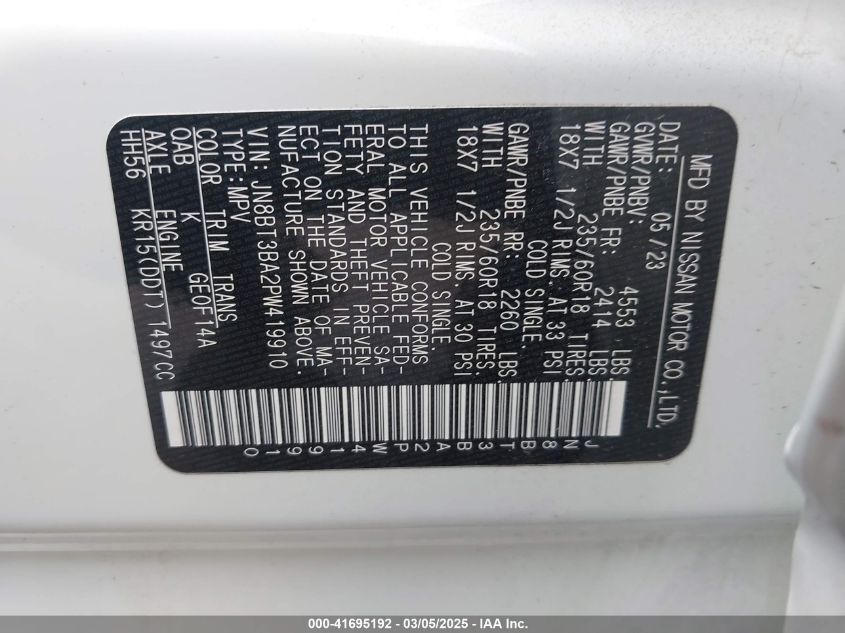 Color WhiteCylinders 3Drive Front wheel driveVIN JN8BT3BA2PW******State Run & Drive VerifiedDamage Front or backAuction date 2025-03-26 AutoRIA