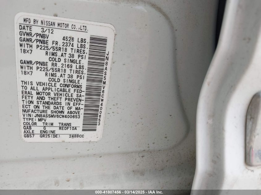 Color WhiteCylinders 4Drive Full driveVIN JN8AS5MV6CW******State Run & Drive VerifiedDamage Front right AutoRIA