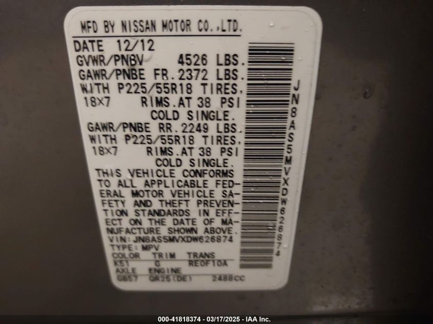 Color GrayCylinders 4Drive Full driveVIN JN8AS5MVXDW******State Run & Drive VerifiedDamage Rear rightAuction date 2025-03-20 AutoRIA