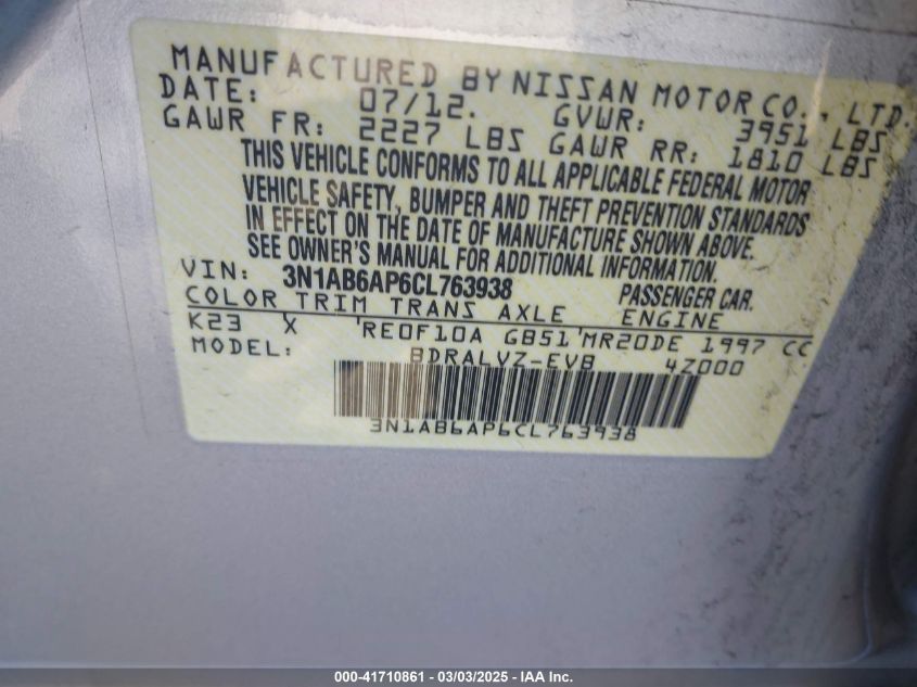 2012 NISSAN SENTRA 2012 Gasoline, 2.0, Front wheel drive, VIN - 3N1AB6AP6CL****** from the USA