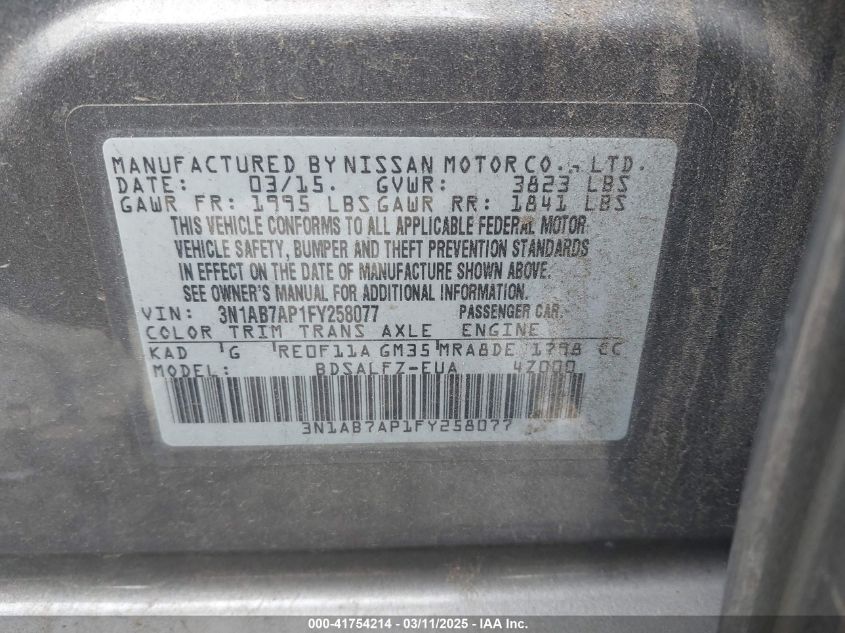 Color GrayCylinders 4Drive Front wheel driveVIN 3N1AB7AP1FY******State Run & Drive VerifiedDamage Front rightAuction date 2025-03-25 AutoRIA