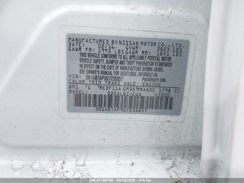 Color WhiteCylinders 4Drive Front wheel driveVIN 3N1AB7AP9GY******State Run & Drive VerifiedDamage Front or back AutoRIA