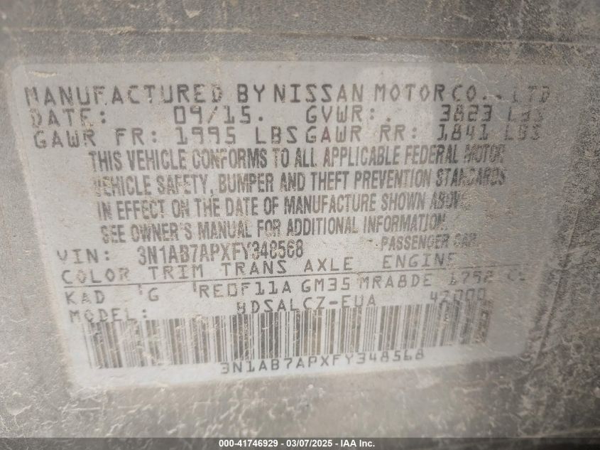 Color GrayCylinders 4Drive Front wheel driveVIN 3N1AB7APXFY******State Run & Drive VerifiedDamage Front left AutoRIA