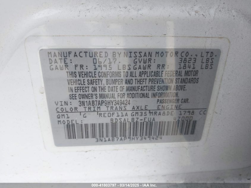 Color WhiteCylinders 4Drive Front wheel driveVIN 3N1AB7AP9HY******State Run & Drive VerifiedDamage Rear right AutoRIA