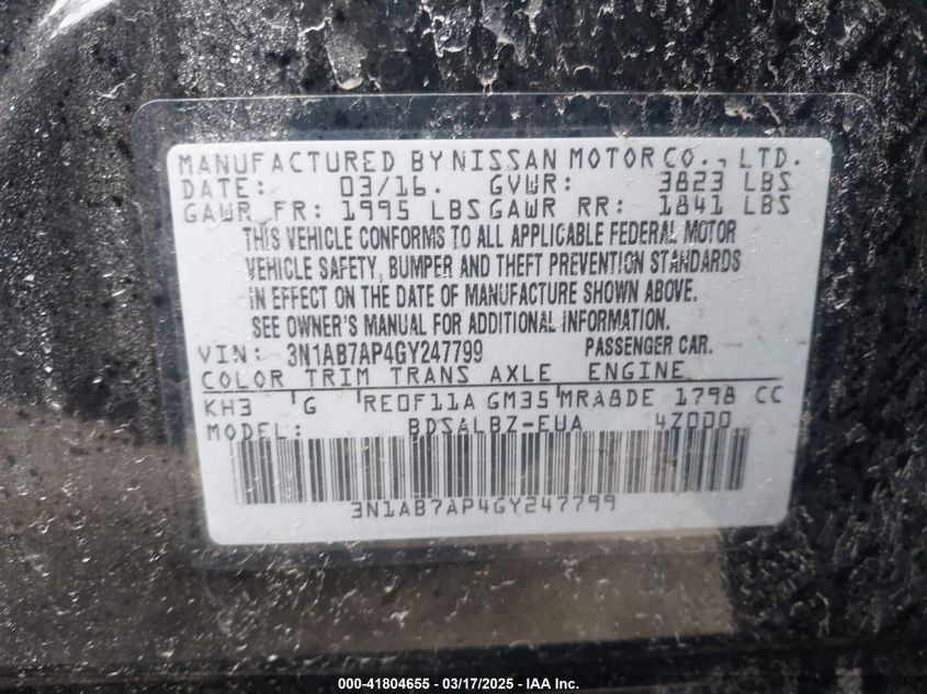 Color BlackCylinders 4Drive Front wheel driveVIN 3N1AB7AP4GY******State Run & Drive VerifiedDamage Front or back AutoRIA