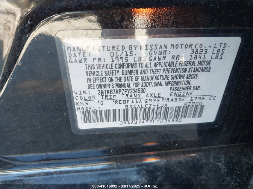 Color BlackCylinders 4Drive Front wheel driveVIN 3N1AB7AP7FY******State Run & Drive VerifiedDamage Back AutoRIA