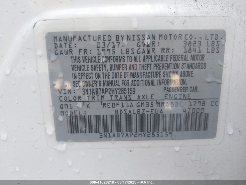 Color WhiteCylinders 4Drive Front wheel driveVIN 3N1AB7AP2HY******State Run & Drive VerifiedDamage Insignificant AutoRIA