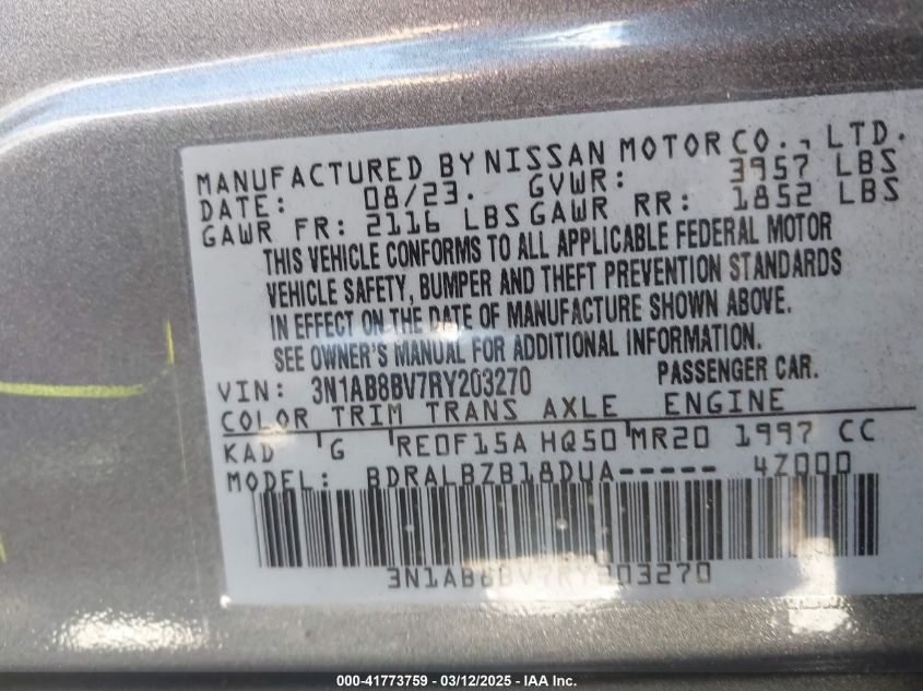 Color GrayCylinders 4Drive Front wheel driveVIN 3N1AB8BV7RY******State Run & Drive VerifiedDamage Right side