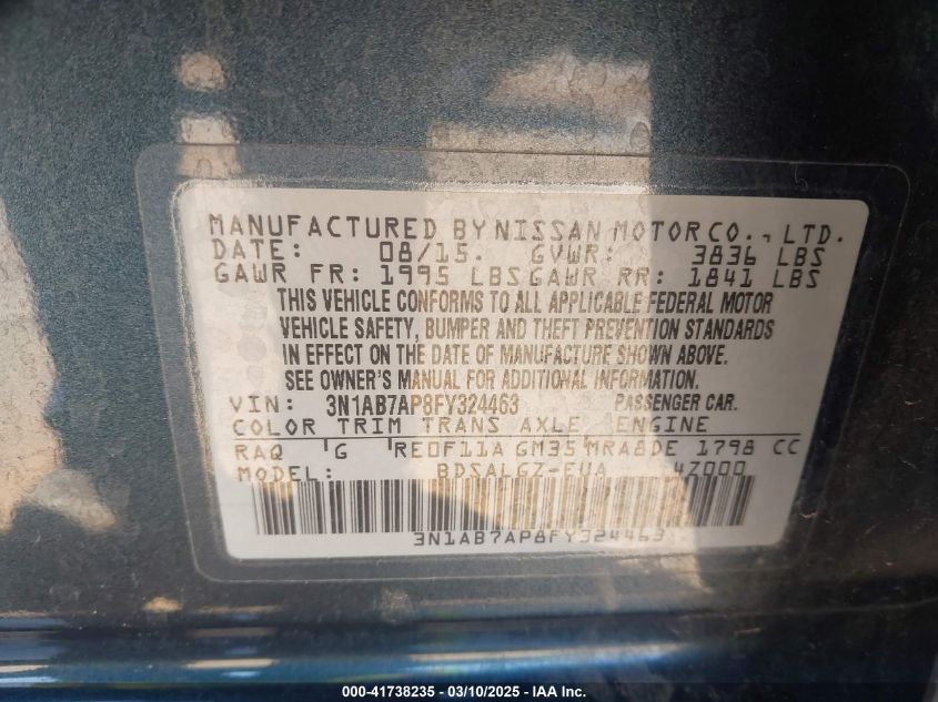 Color BlueCylinders 4Drive Front wheel driveVIN 3N1AB7AP8FY******State Run & Drive VerifiedDamage Front right AutoRIA