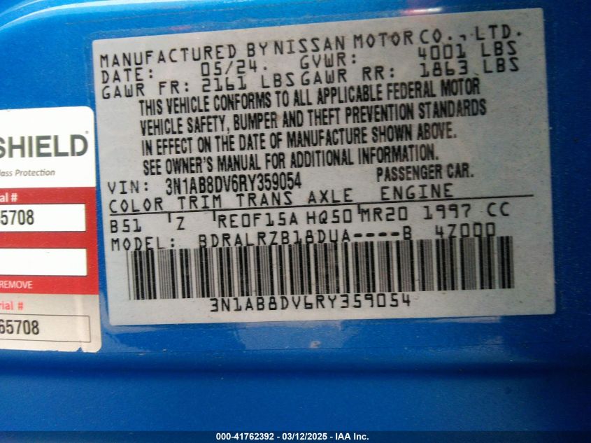 2024 NISSAN SENTRA 2024 Gasoline, 2.0, Front wheel drive, VIN - 3N1AB8DV6RY****** from the USA
