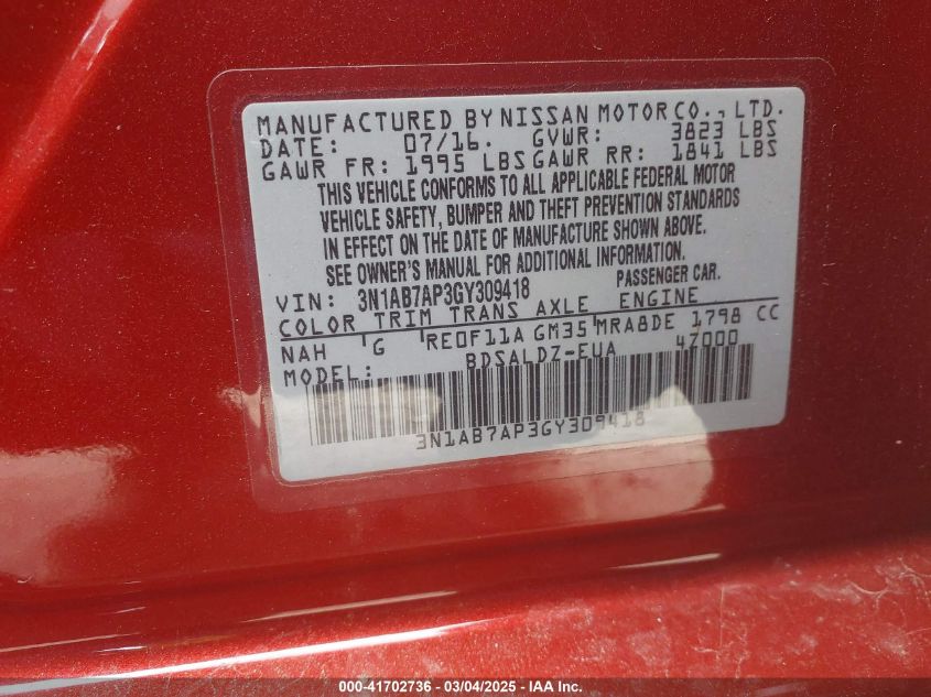 2016 NISSAN SENTRA 2016 Gasoline, 1.8, Front wheel drive, VIN - 3N1AB7AP3GY****** from the USA