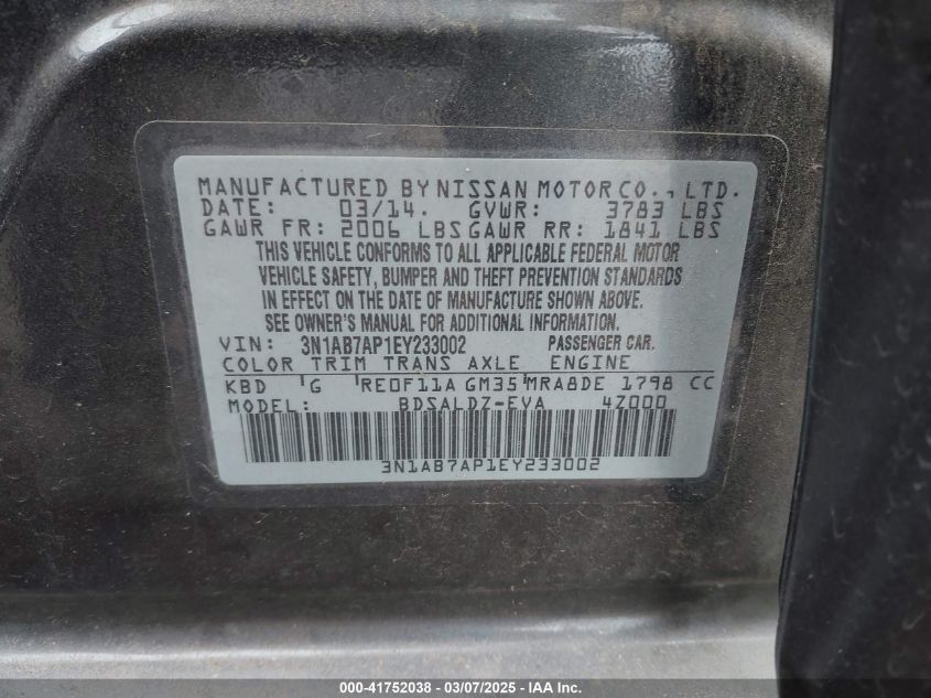Color GrayCylinders 4Drive Front wheel driveVIN 3N1AB7AP1EY******State Run & Drive VerifiedDamage Front or back AutoRIA