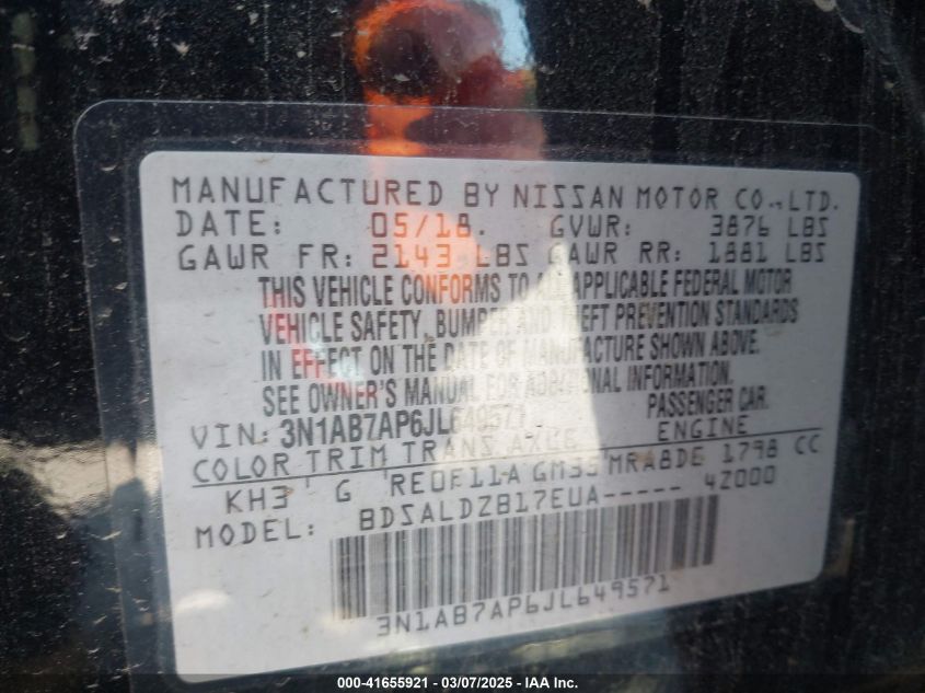 Color BlackCylinders 4Drive Front wheel driveVIN 3N1AB7AP6JL******State Run & Drive VerifiedDamage Back AutoRIA