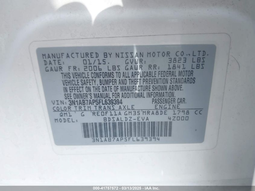 2015 NISSAN SENTRA 2015 Gasoline, 1.8, Front wheel drive, VIN - 3N1AB7AP5FL****** from the USA